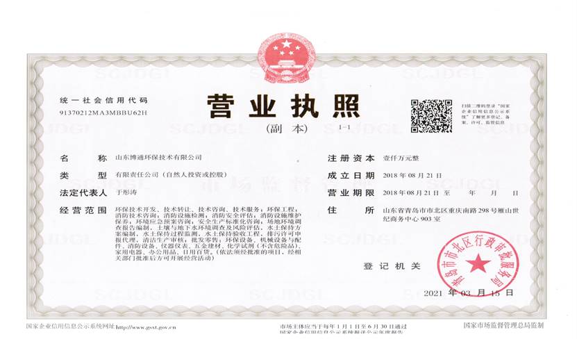 山東博通環保技術有限公司是一家專業從事環保、安全、消防的多元化技術服務公司,公司致力于打造專業的技術服務團隊,立足青島,輻射山東,服務范圍涵蓋:環保技術開發、技術轉讓、技術咨詢、技術服務;環保工程;消防技術咨詢;消防設施檢測;消防安全評估;消防設施維護保養;環境應急預案咨詢;安全生產標準化咨詢;場地環境調查報告編制,土壤與地下水環境調查及風險評估,水土保持方案編制,水土保持過程監測,水土保持驗收工程,排污許可申報代理,清潔生產審核;批發零售:環保設備、機械設備與配件、消防設備、儀器儀表、五金建材、化學試劑(不含危險品)。公司具有“建設手續一站式辦理,安環問題一條龍解決”的獨特優勢,可為客戶提供高效、優質的安全、環保、消防管家技術服務。